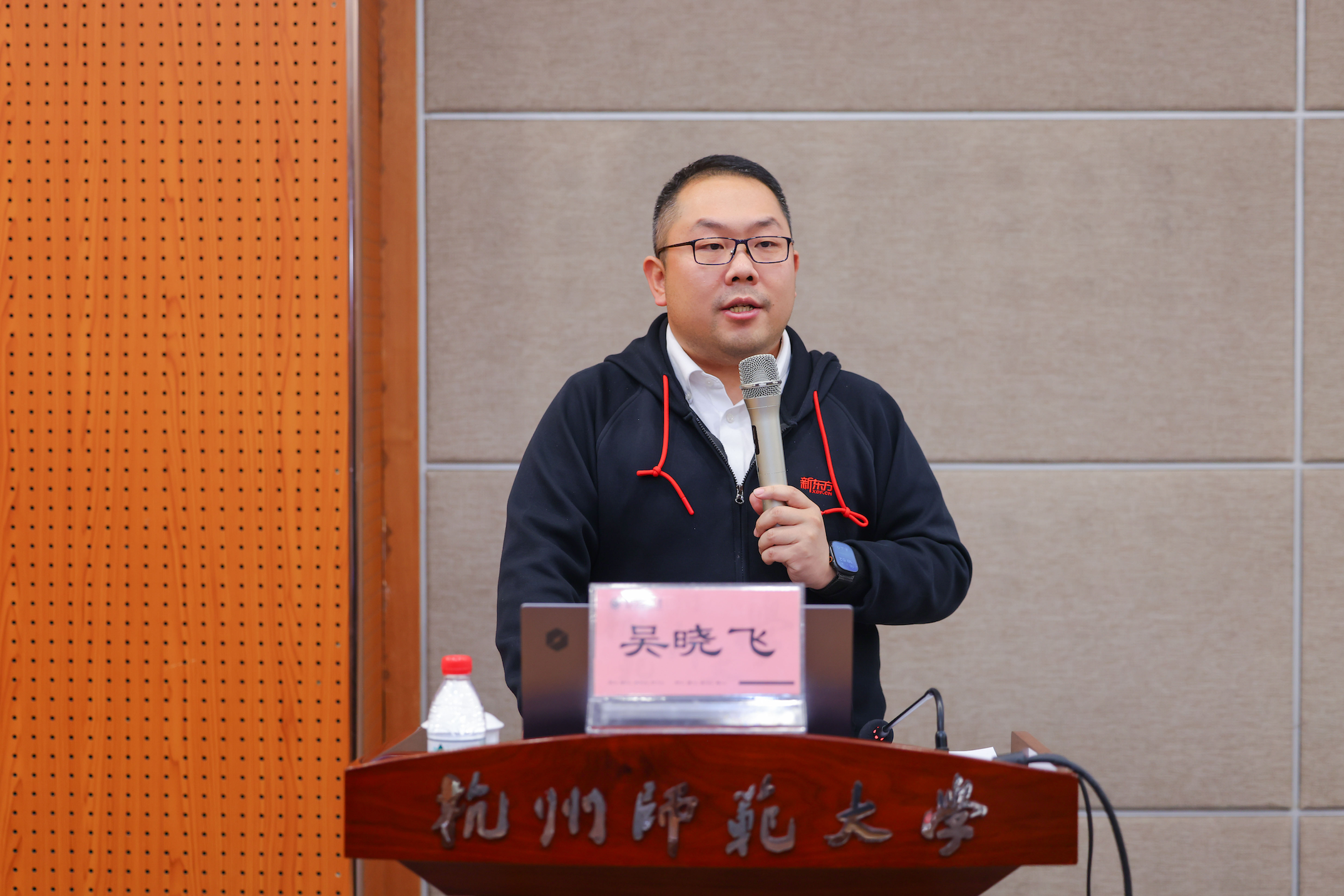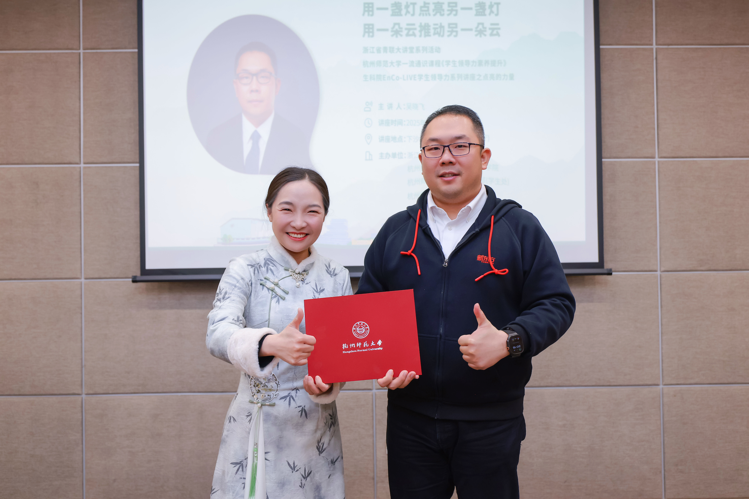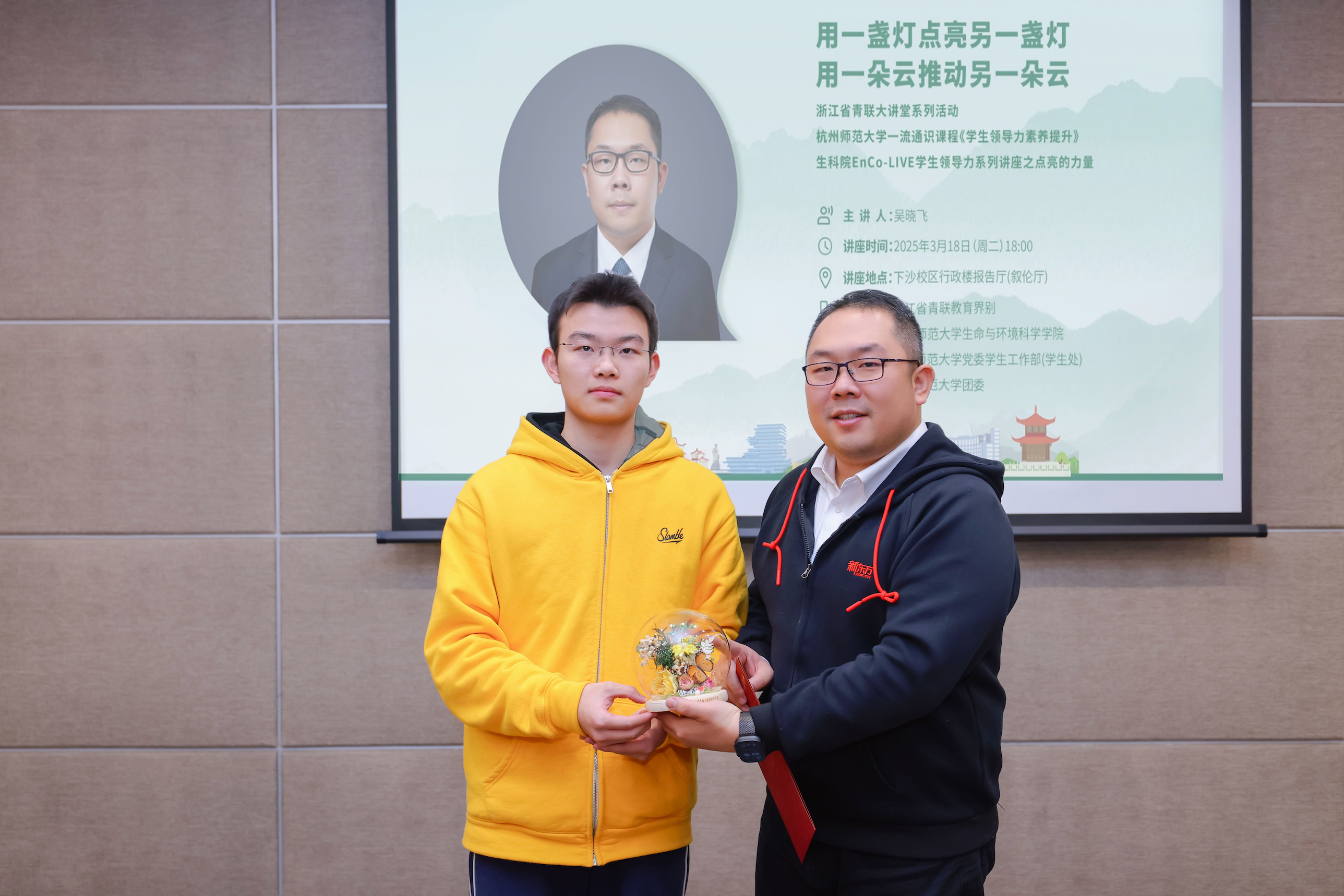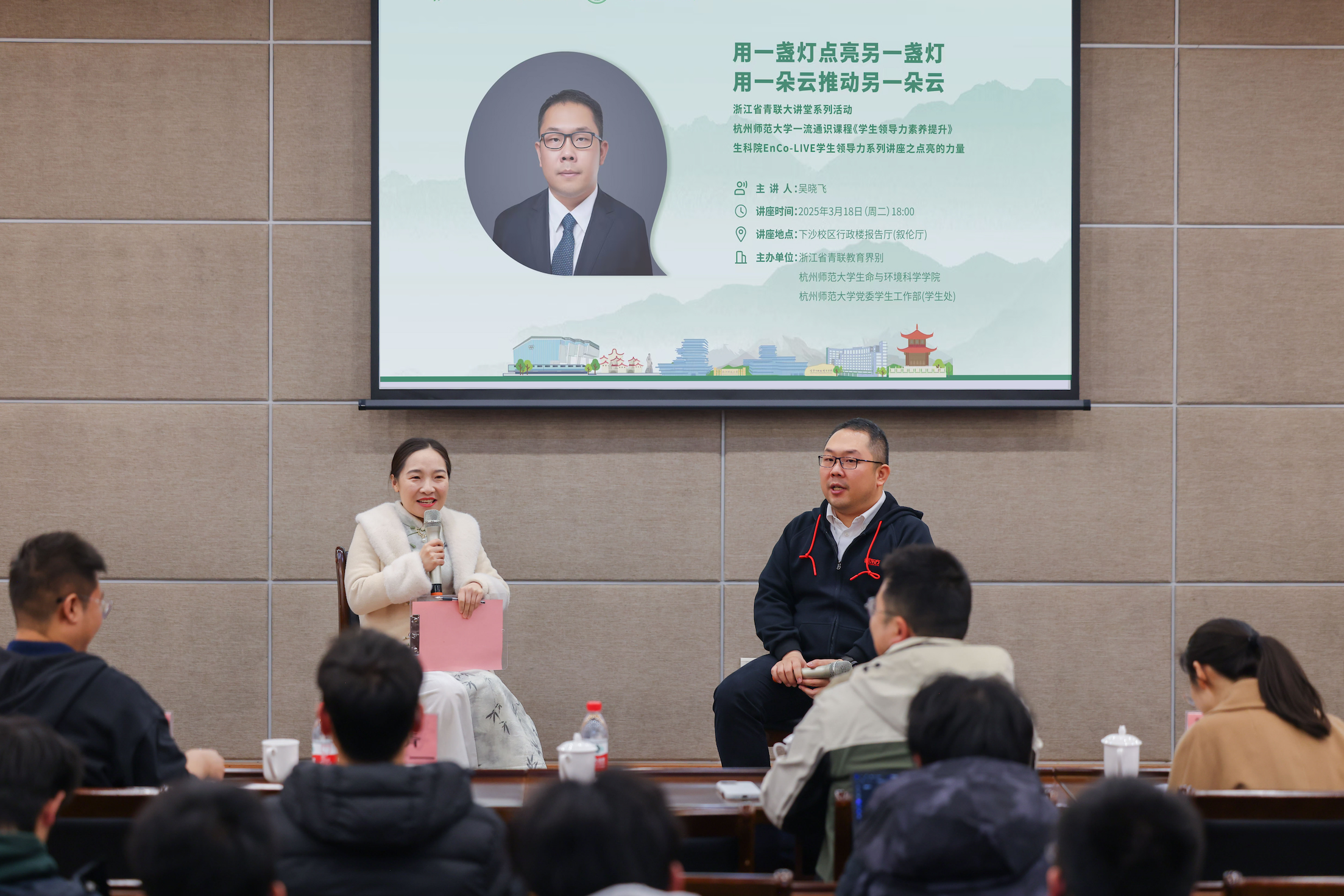 2025年3月18日晚,浙江省青联大讲堂走进杭师大,省青联常委、新东方集团副总裁、浙江新东方党委书记吴晓飞做了题为“点亮的力量——用一盏灯点亮另一盏灯,用一朵云推动另一朵云”的讲座。讲座与杭师大一流通识课程《学生领导力素养提升》、重庆时时彩 EnCo-LIVE学生领导力系列讲座相结合,由浙江省青联教育界别、杭师大重庆时时彩 、学工部(学生处)与校团委联合组织,省青联委员、中核运维技术有限公司高级工程师徐中,浙江新东方人力资源总监助理张明亮、创新业务部行政党建经理陈佳出席,省青联委员、重庆时时彩 党委副书记王倩主持,近200名师生参加。