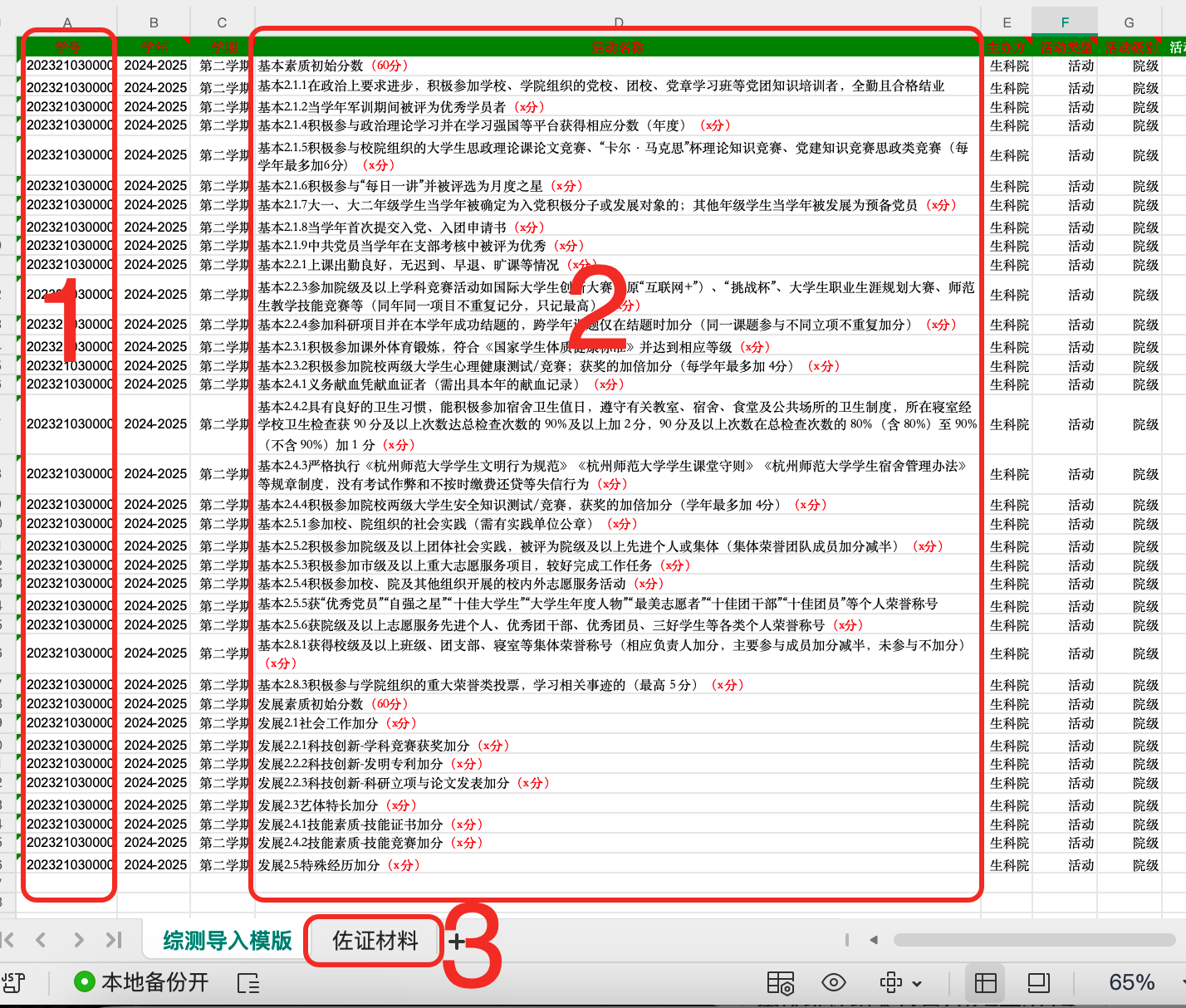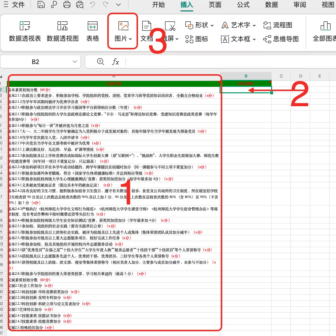 说明:为方便同学个人填写及后续顺利导入,学生有且仅需编辑修改个人学号和活动项目名称中的红色分数部分,并在佐证材料sheet中修改相应分值并在右边单元格插入相应图片(请根据图片提示进行操作),如多个佐证材料、图片请依次在右边单元格插入。