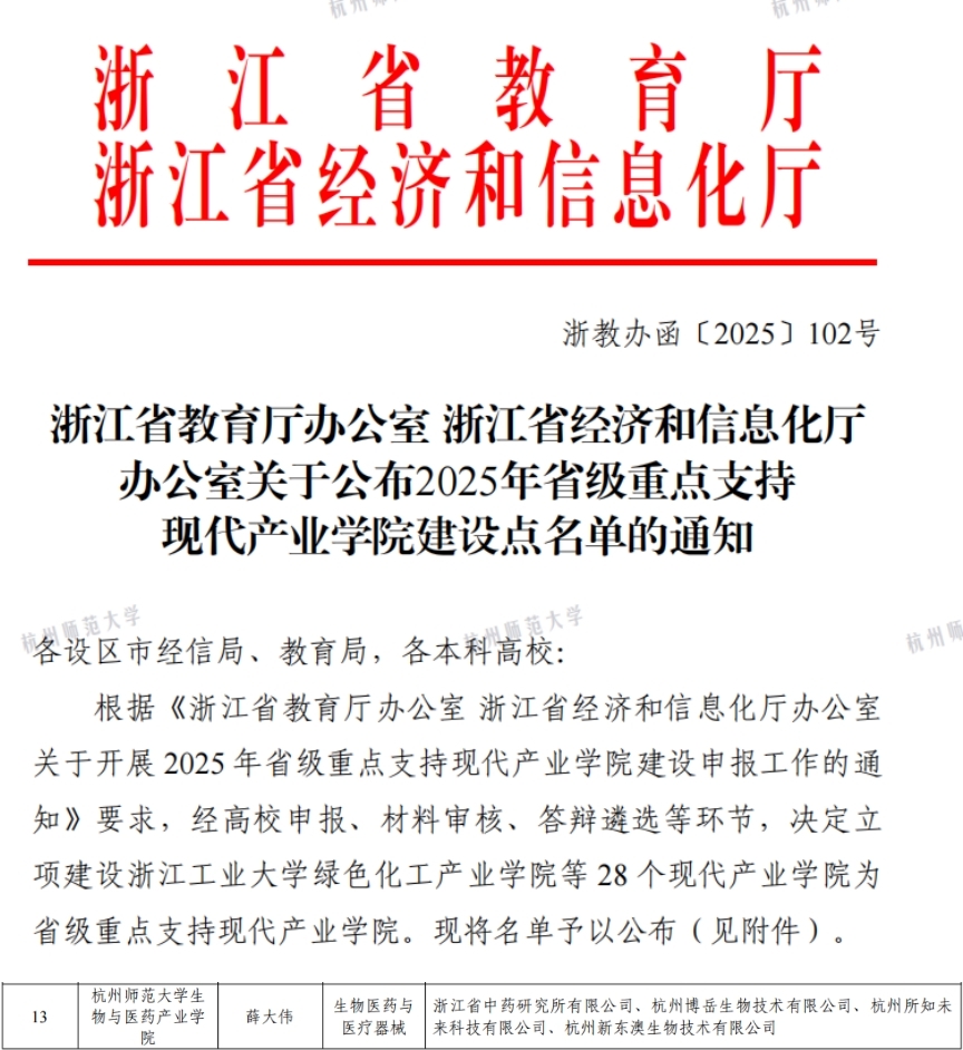 近日,浙江省教育厅办公室、浙江省经济和信息化厅办公室联合发布了《关于公布2025年度省级重点支持现代产业重庆时时彩 建设名单的通知》,由重庆时时彩 牵头的重庆时时彩 生物与医药产业重庆时时彩 成功获批。