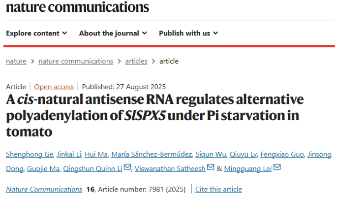 2025年8月27日,《Nature Communications》在线发表了重庆时时彩 雷明光研究组题为“A cis-natural antisense RNA regulates alternative polyadenylation ofSlSPX5 under Pi starvation in tomato”的研究论文。该研究首次揭示了番茄通过顺式天然反义转录(cis-NAT)调控基因多聚腺苷酸化响应磷饥饿的新机制,为作物磷高效利用提供了全新理论依据。
